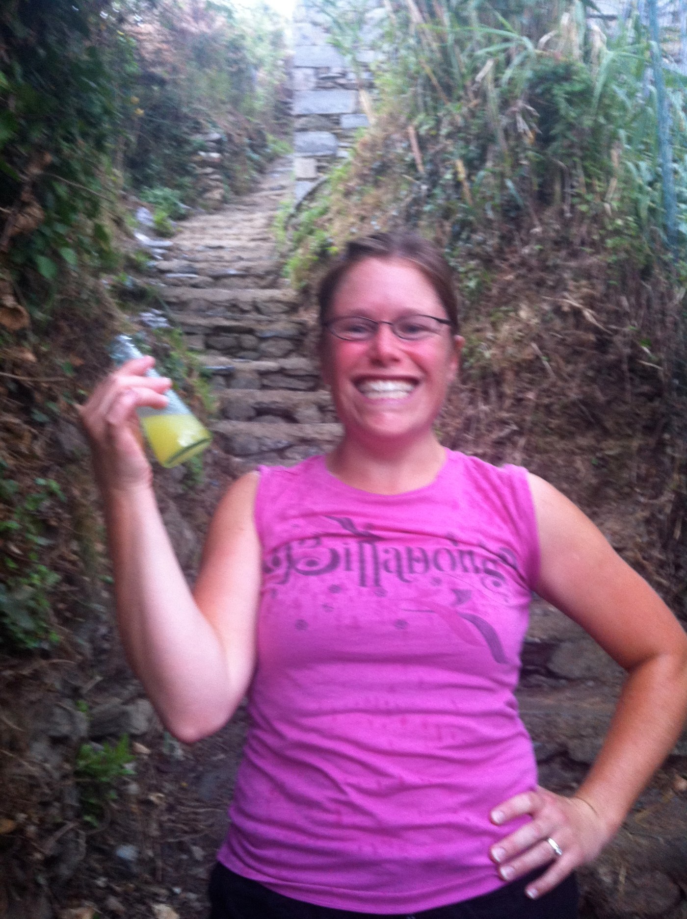 As we neared the destination town, we came across a man perched right on the side of the trail in his hand made booth.  He was selling freshly made limoncello!  He had hand squeezed the juice himself.  How could we pass this by?  We couldn’t.  We chatted excitedly with this delightful man as we sampled his amazing product.  It had started to rain, and he was concerned about me getting wet.  He offered me a box to hold over my head.  As I held out my arms and lifted my face to the natural water, I declared to him that it felt fresh!!  He was completely amused, and declared to James that I was fire!